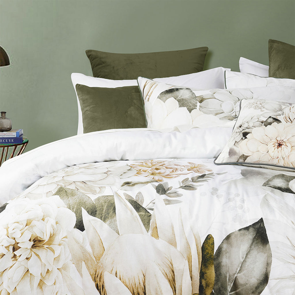 Stunning large florals and foliage sweep over the bed in gorgeous neutral tones featuring a variety of exquisite green hues. Elegantly piped edging in green complements the quilt cover beautifully. The quilt cover display a palette of white, green, cream, yellow, black, taupe, and grey colour tones.